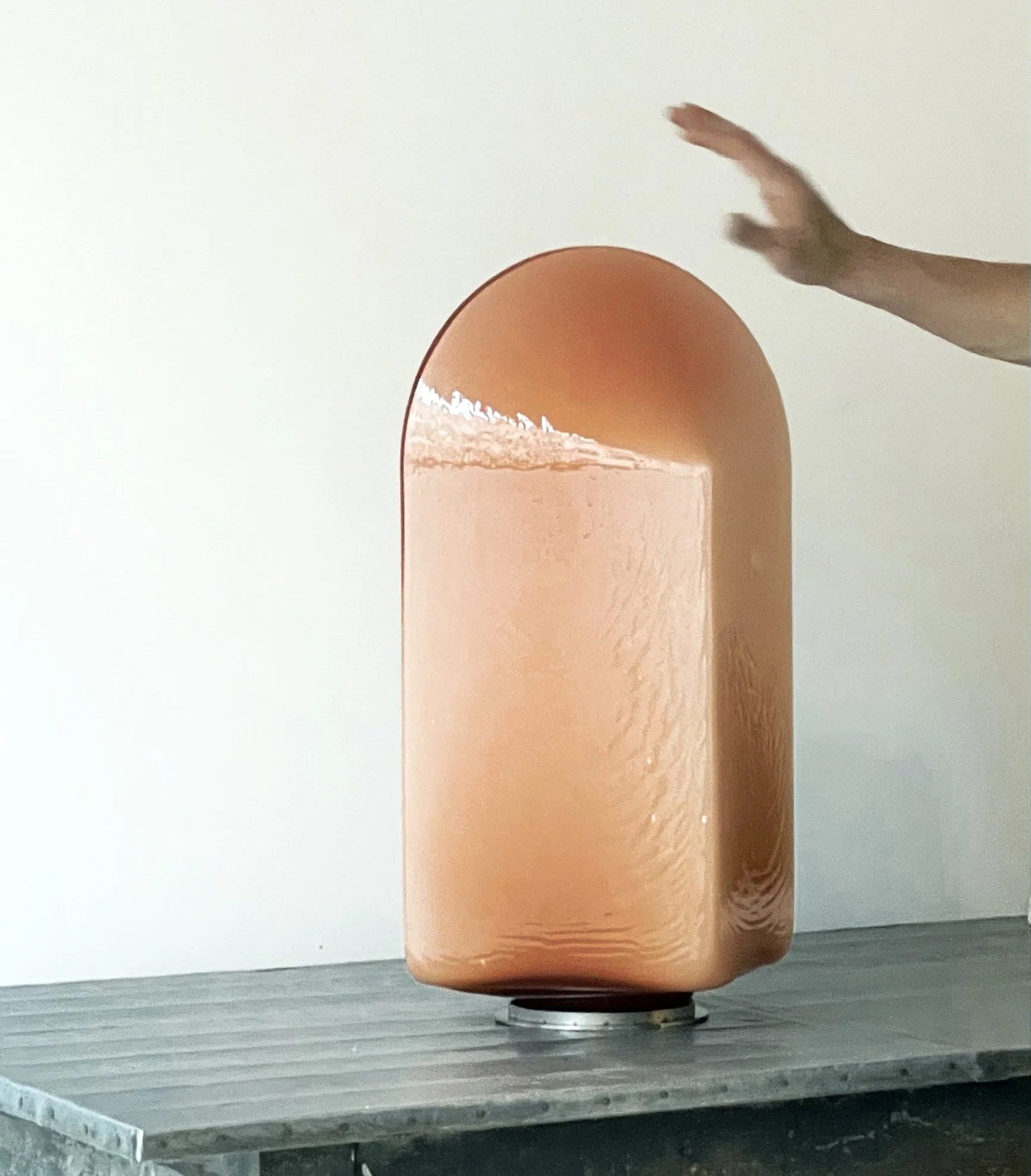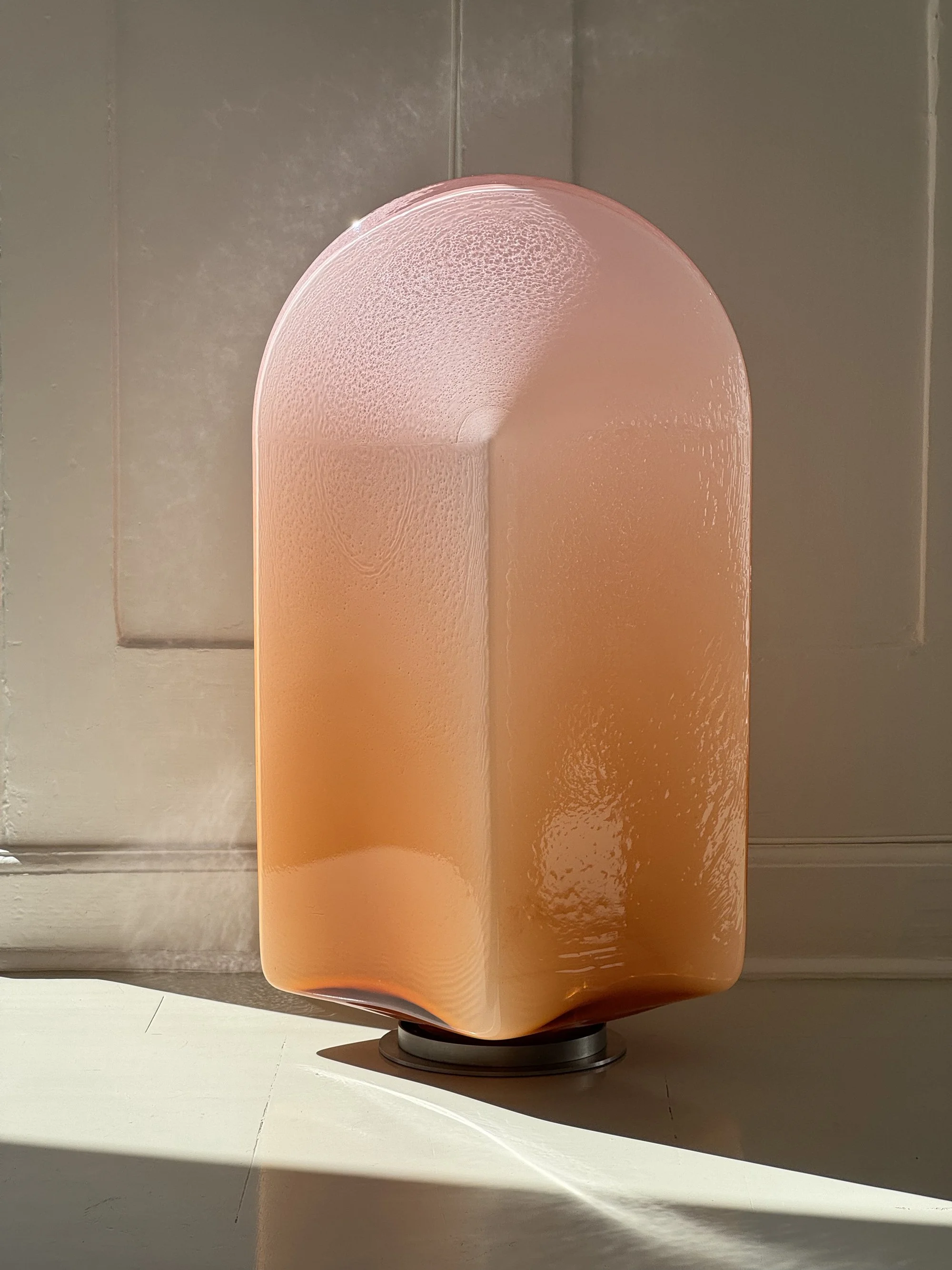 Abendrot (Evening Red) is a transparant colour that is layed on top of white opaque glass. As the name implies, the colour can vary from a soft orangy blush to a more bluish pink.